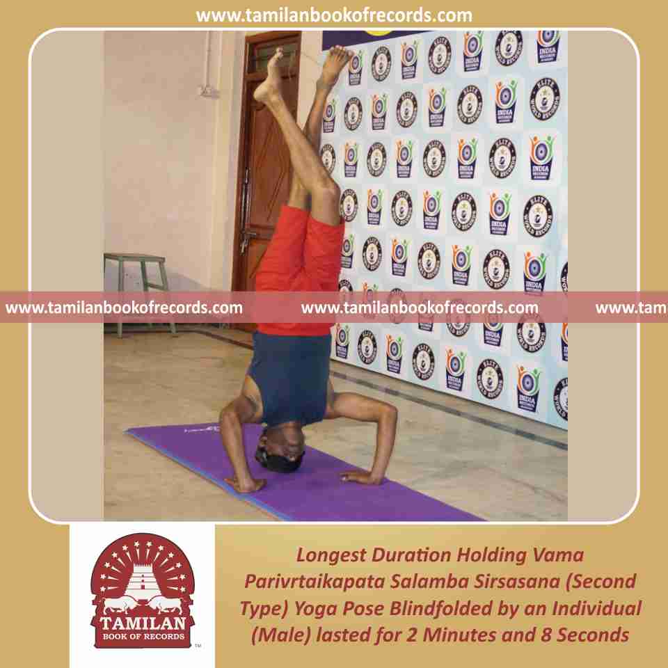 Longest Duration Holding Vama Parivrtaikapata Salamba Sirsasana (Second Type) Yoga Pose Blindfolded by an Individual (Male)
