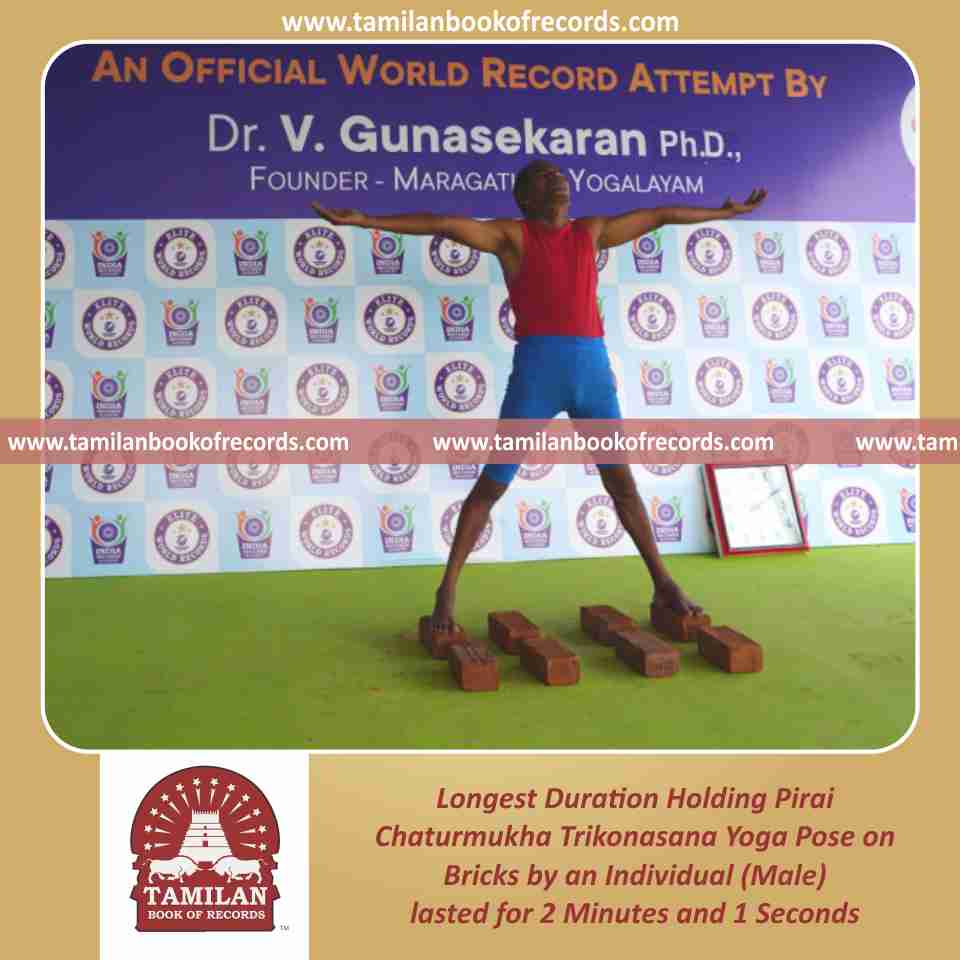 Longest Duration Holding Pirai Chaturmukha Trikonasana Yoga Pose on Bricks by an Individual (Male)