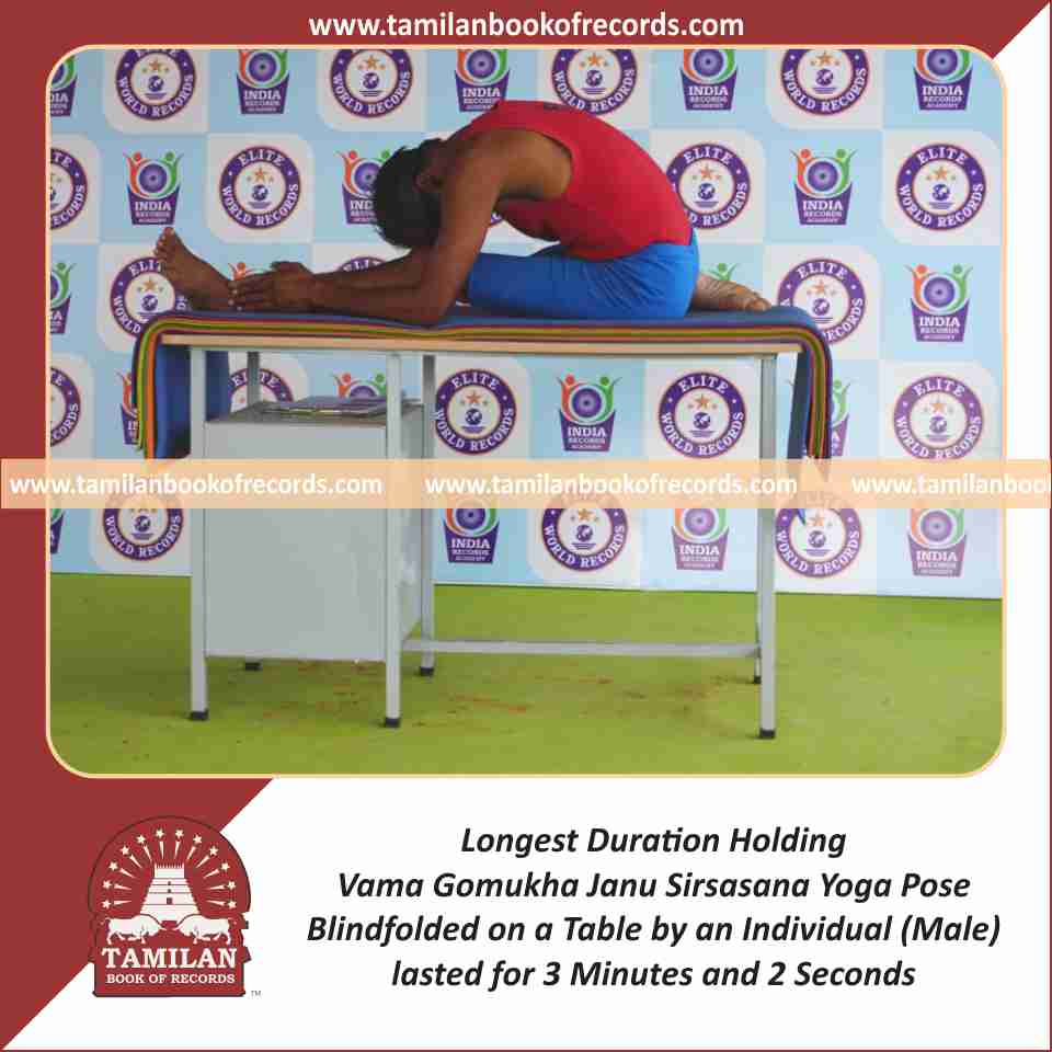 Longest Duration Holding Vama Gomukha Janu Sirsasana Yoga Pose Blindfolded on a Table by an Individual (Male)