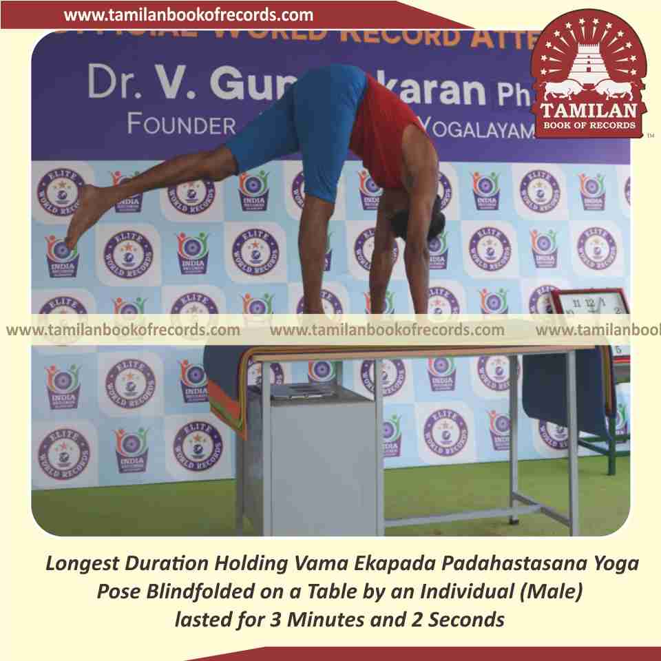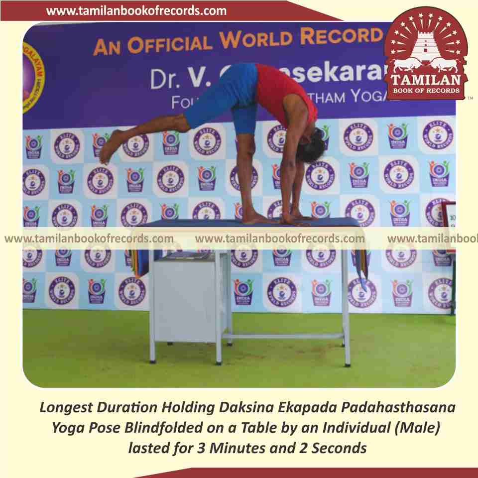 Longest Duration Holding Daksina Ekapada Padahasthasana Yoga Pose Blindfolded on a Table by an Individual (Male)