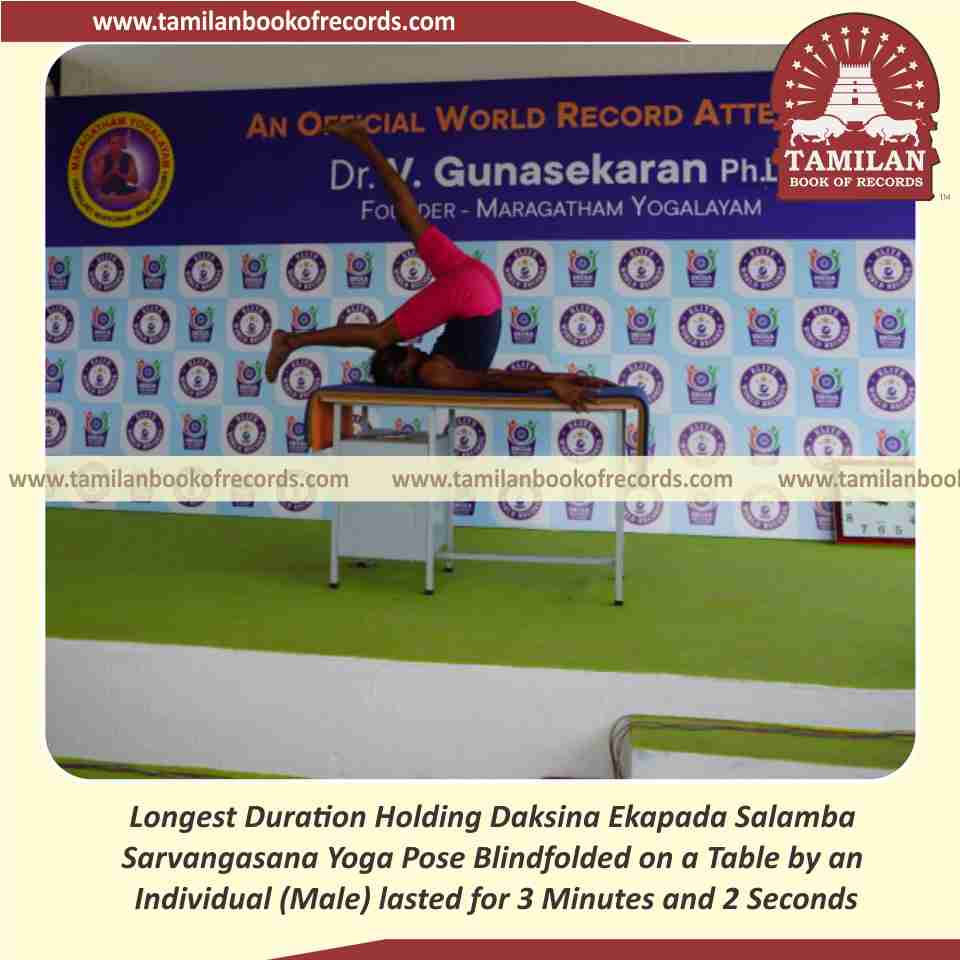Longest Duration Holding Daksina Ekapada Salamba Sarvangasana Yoga Pose Blindfolded on a Table by an Individual (Male)
