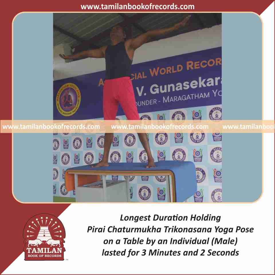Longest Duration Holding Pirai Chaturmukha Trikonasana Yoga Pose on a Table by an Individual (Male)