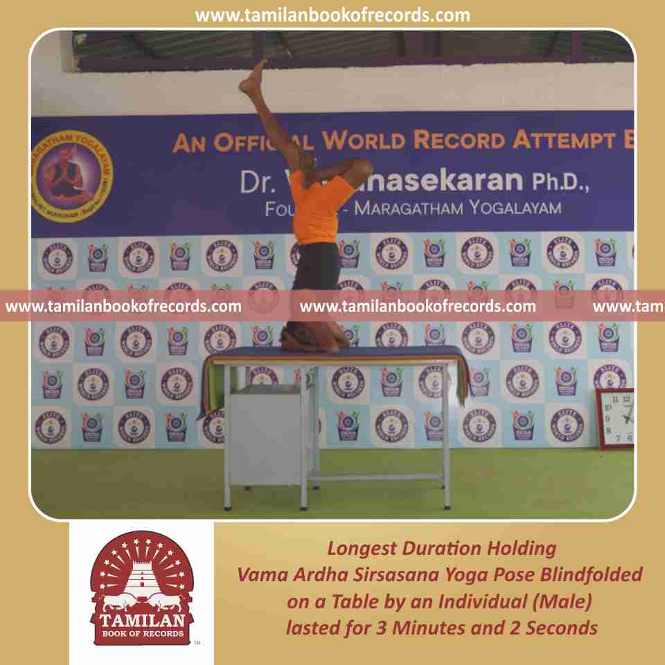 Longest Duration Holding Vama Ardha Sirsasana Yoga Pose Blindfolded on a Table by an Individual (Male)