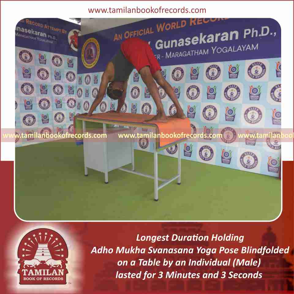 Longest Duration Holding Adho Mukha Svanasana Yoga Pose Blindfolded on a Table by an Individual (Male)