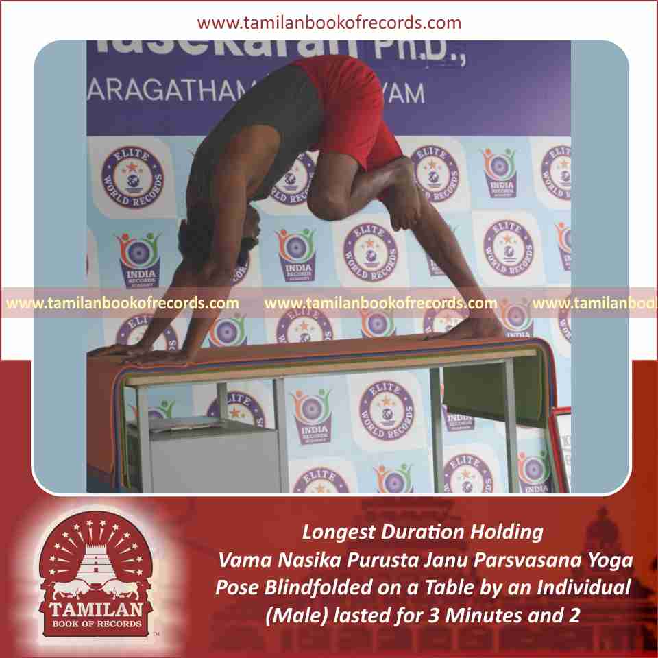 Longest Duration Holding Vama Nasika Purusta Janu Parsvasana Yoga Pose Blindfolded on a Table by an Individual (Male)