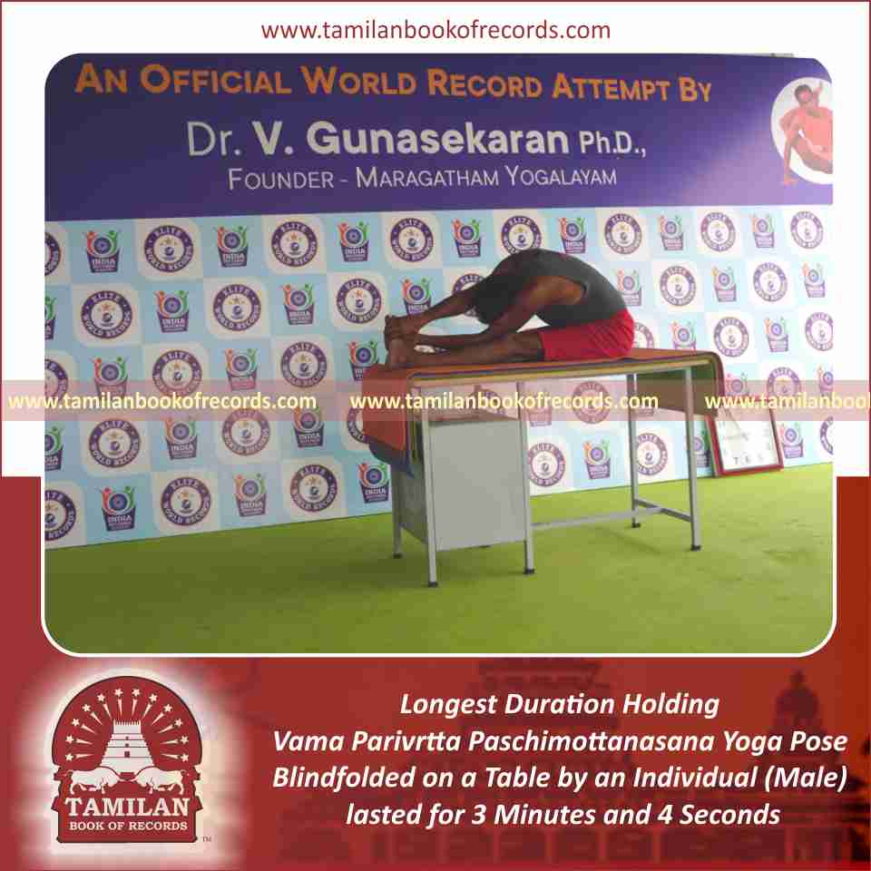 Longest Duration Holding Vama Parivrtta Paschimottanasana Yoga Pose Blindfolded on a Table by an Individual (Male)