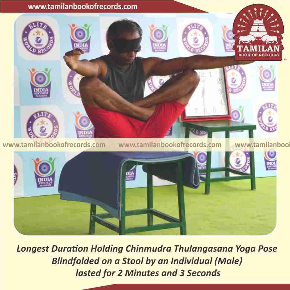 Longest Duration Holding Chinmudra Thulangasana Yoga Pose Blindfolded on a Stool by an Individual (Male)