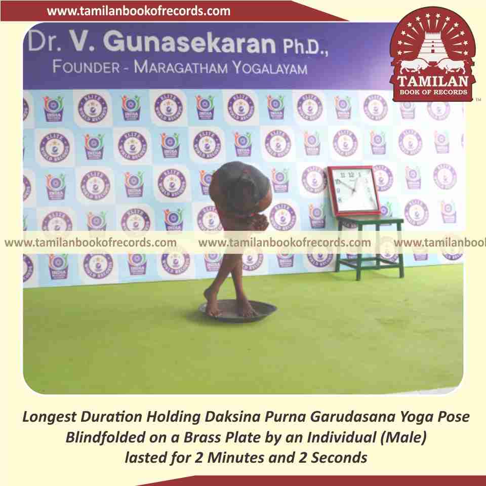 Longest Duration Holding Daksina Purna Garudasana Yoga Pose Blindfolded on a Brass Plate by an Individual (Male)
