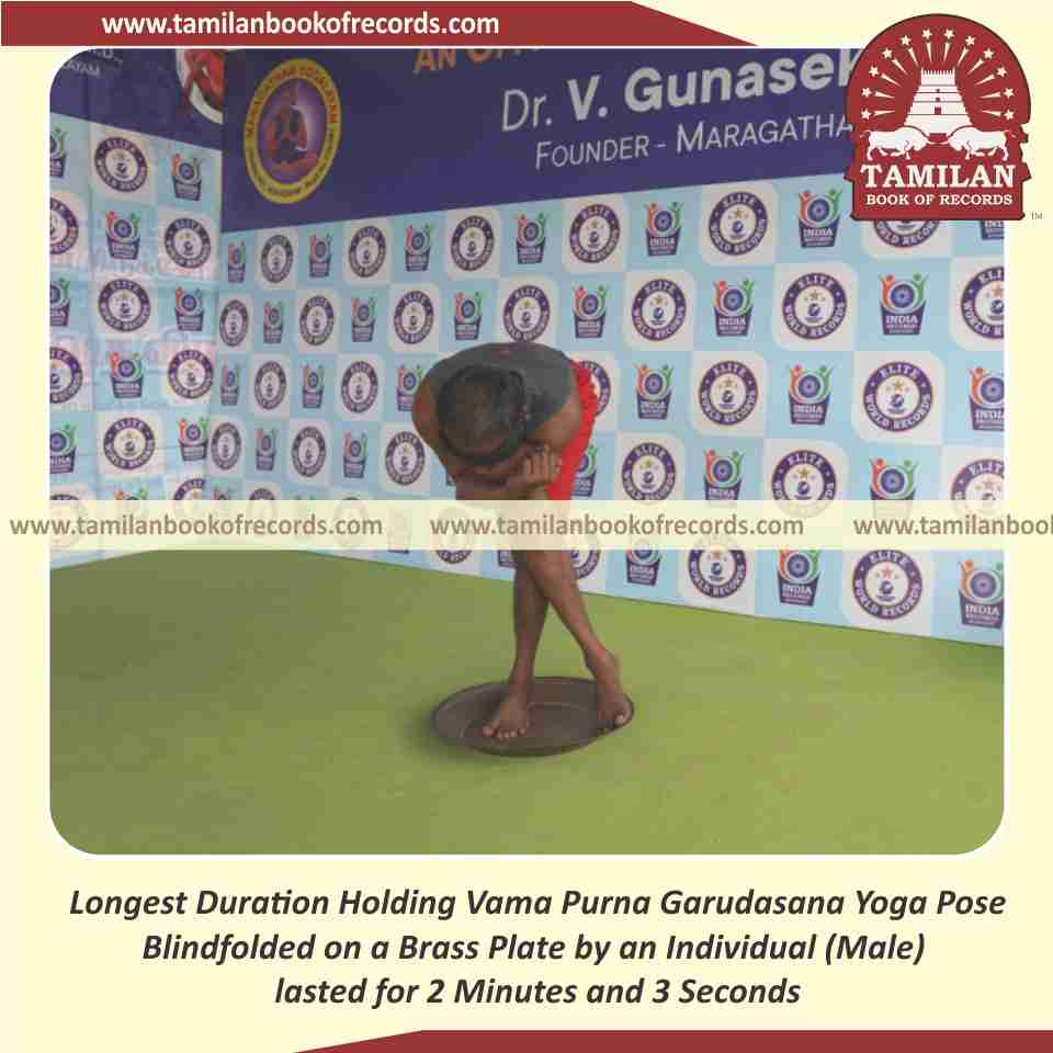 Longest Duration Holding Vama Purna Garudasana Yoga Pose Blindfolded on a Brass Plate by an Individual (Male)