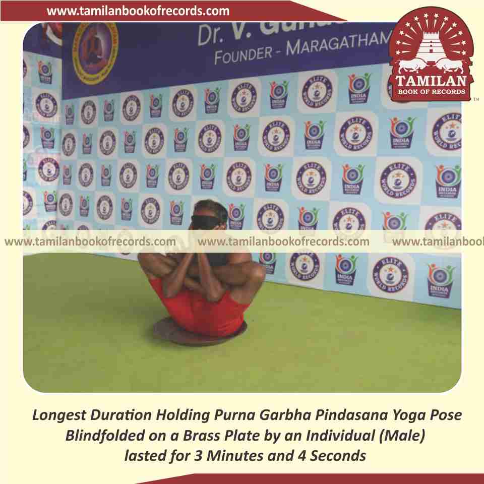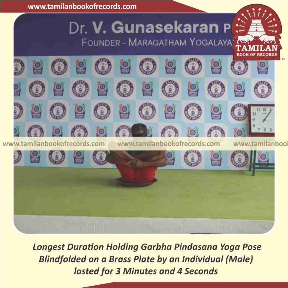 Longest Duration Holding Garbha Pindasana Yoga Pose Blindfolded on a Brass Plate by an Individual (Male)