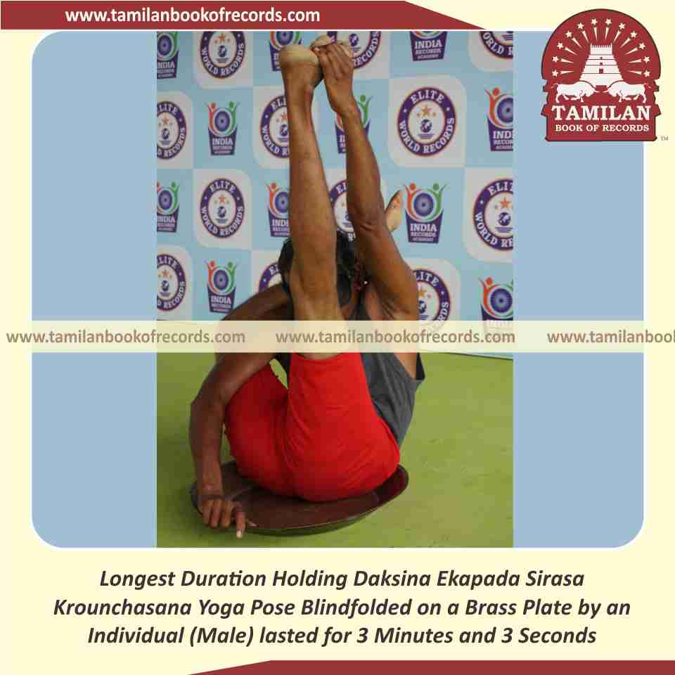 Longest Duration Holding Daksina Ekapada Sirasa Krounchasana Yoga Pose Blindfolded on a Brass Plate by an Individual (Male)