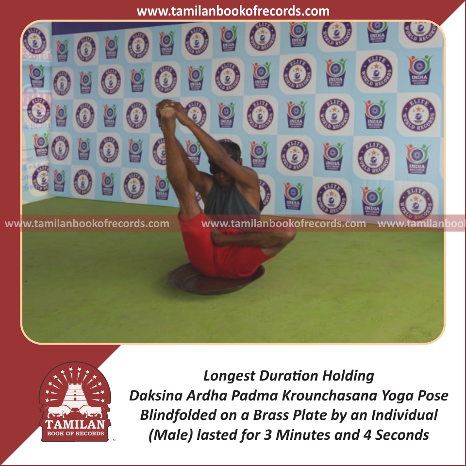 Longest Duration Holding Daksina Ardha Padma Krounchasana Yoga Pose Blindfolded on a Brass Plate by an Individual (Male)