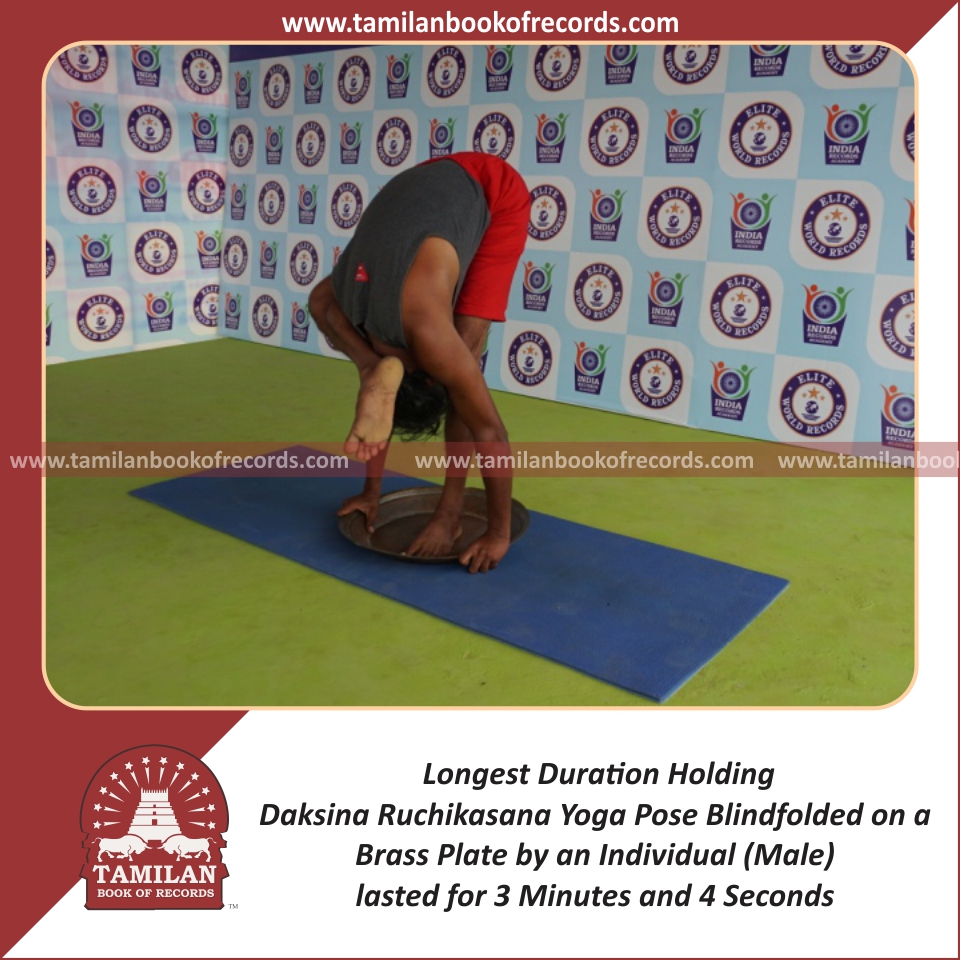 Longest Duration Holding Daksina Ruchikasana Yoga Pose Blindfolded on a Brass Plate by an Individual (Male)