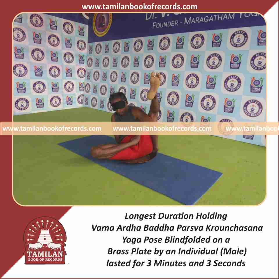 Longest Duration Holding Vama Ardha Baddha Parsva Krounchasana Yoga Pose Blindfolded on a Brass Plate by an Individual (Male)