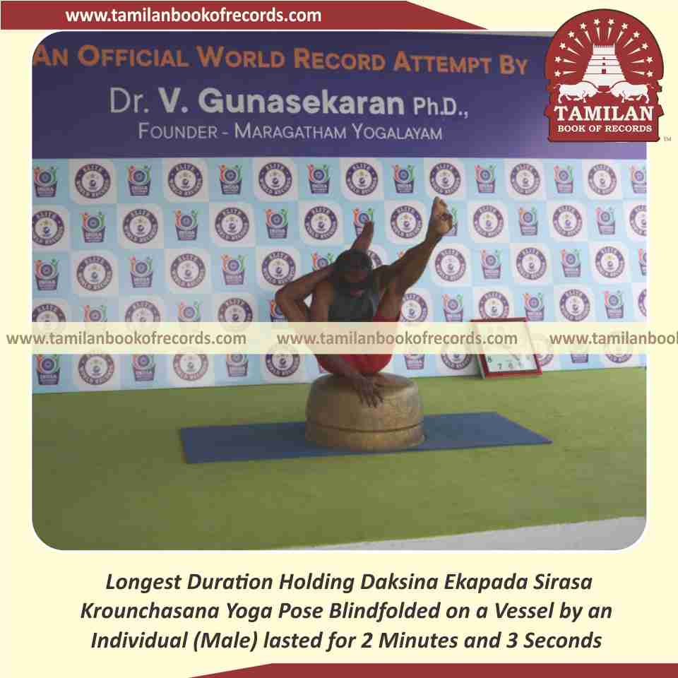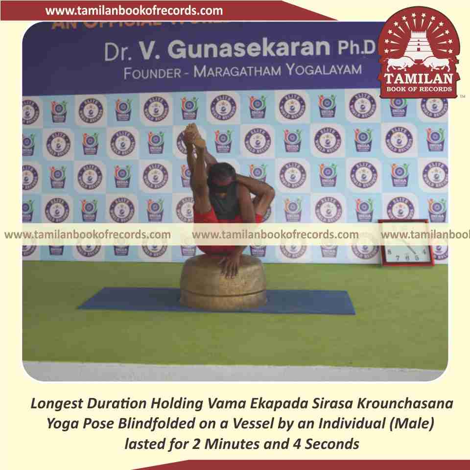 Longest Duration Holding Daksina Ekapada Sirasa Krounchasana Yoga Pose Blindfolded on a Vessel by an Individual (Male)
