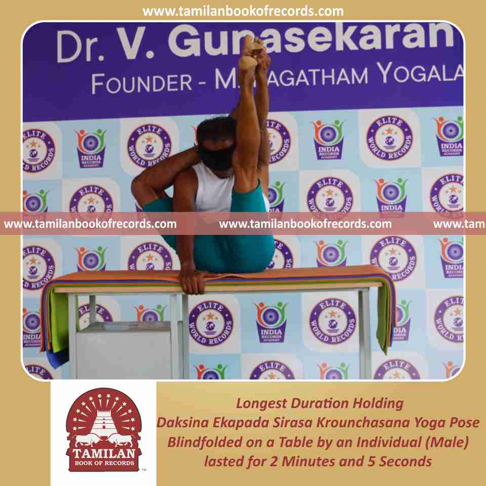Longest Duration Holding Daksina Ekapada Sirasa Krounchasana Yoga Pose Blindfolded on a Table by an Individual (Male)