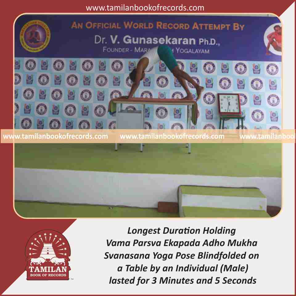 Longest Duration Holding Vama Parsva Ekapada Adho Mukha Svanasana Yoga Pose Blindfolded on a Table by an Individual (Male)