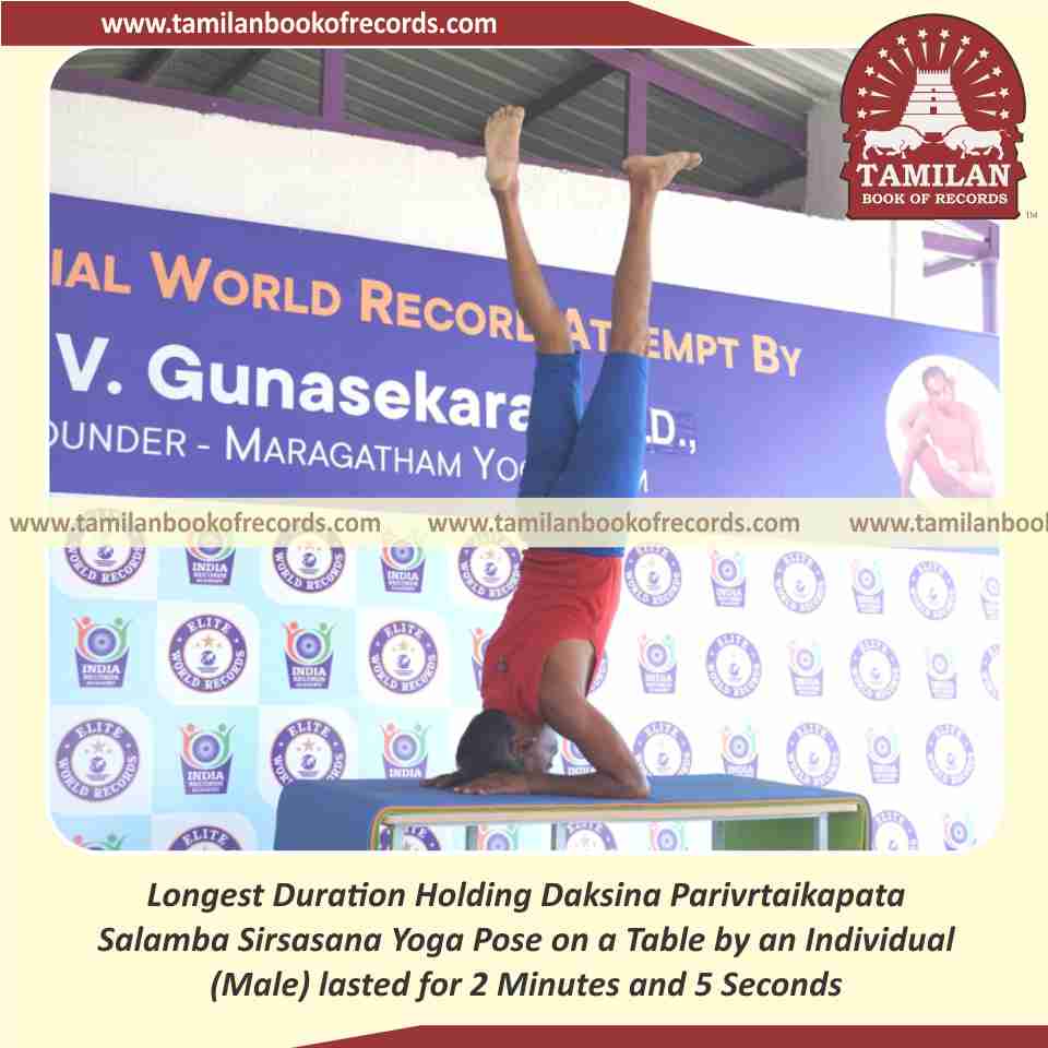Longest Duration Holding Daksina Parivrtaikapata Salamba Sirsasana Yoga Pose on a Table by an Individual (Male)