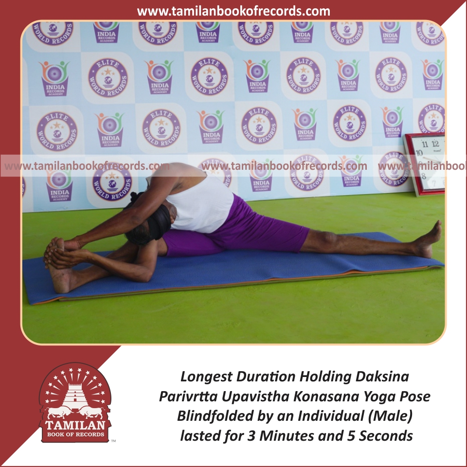 Longest Duration Holding Daksina Parivrtta Upavistha Konasana Yoga Pose Blindfolded by an Individual (Male)