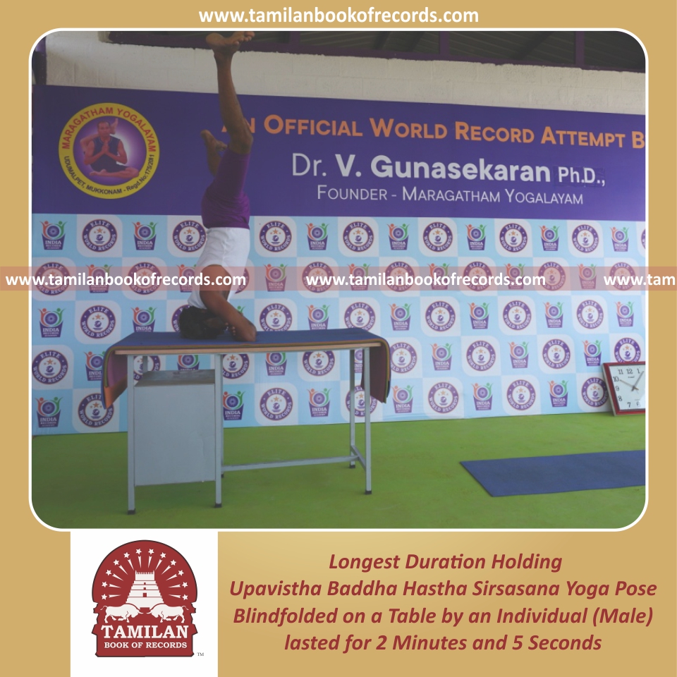 Longest Duration Holding Daksina Parsva Baddha Hastha Sirsasana Yoga Pose Blindfolded on a Table by an Individual (Male)