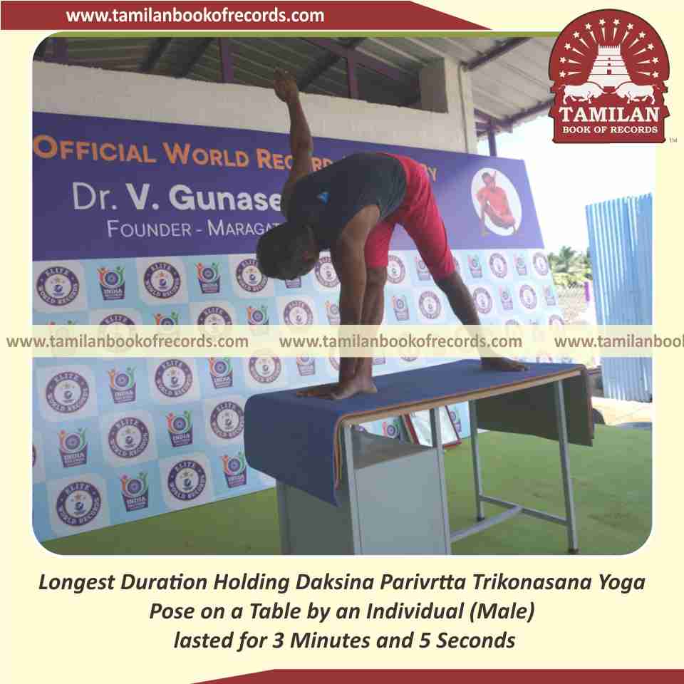 Longest Duration Holding Daksina Parivrtta Trikonasana Yoga Pose on a Table by an Individual (Male)
