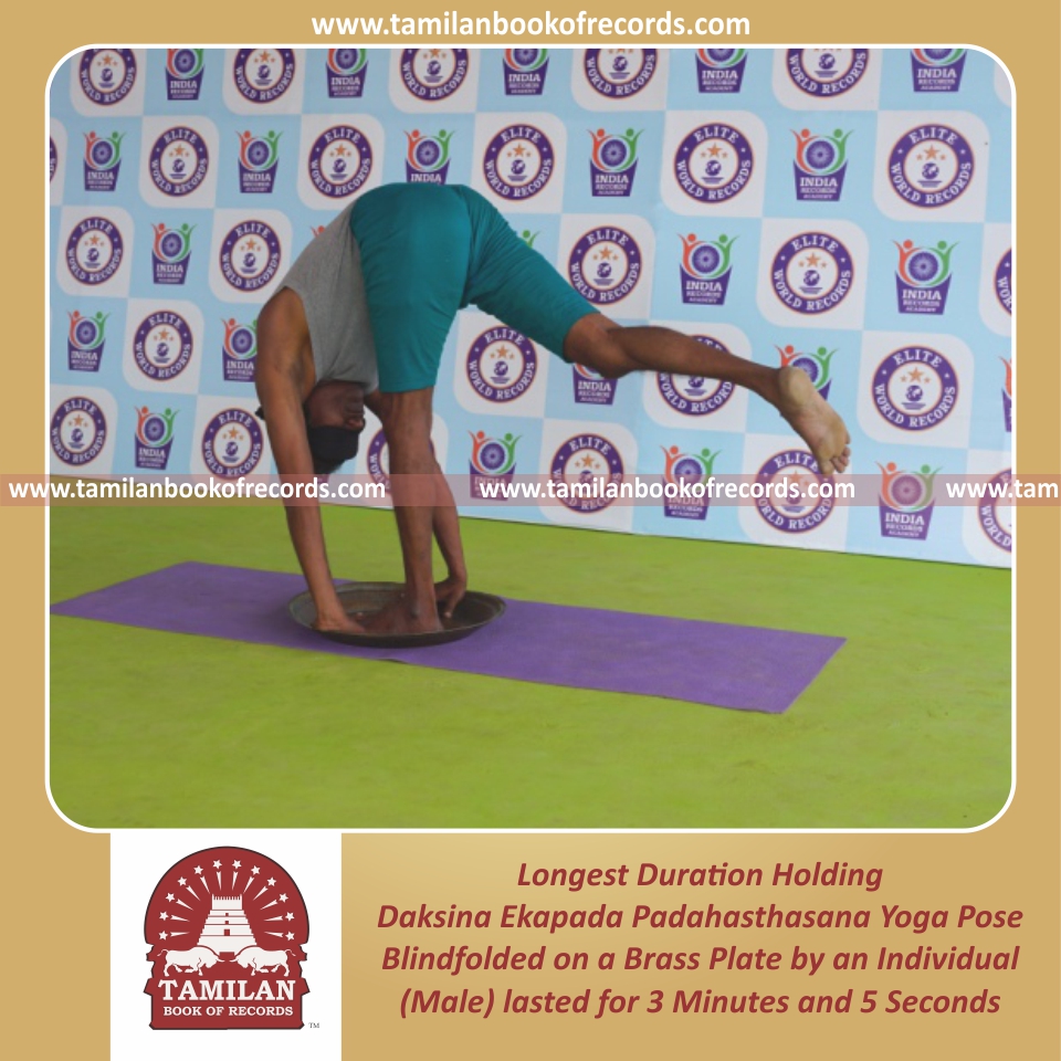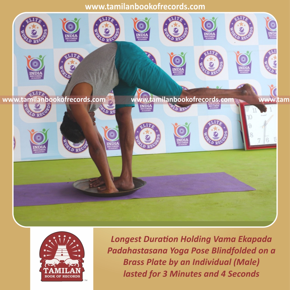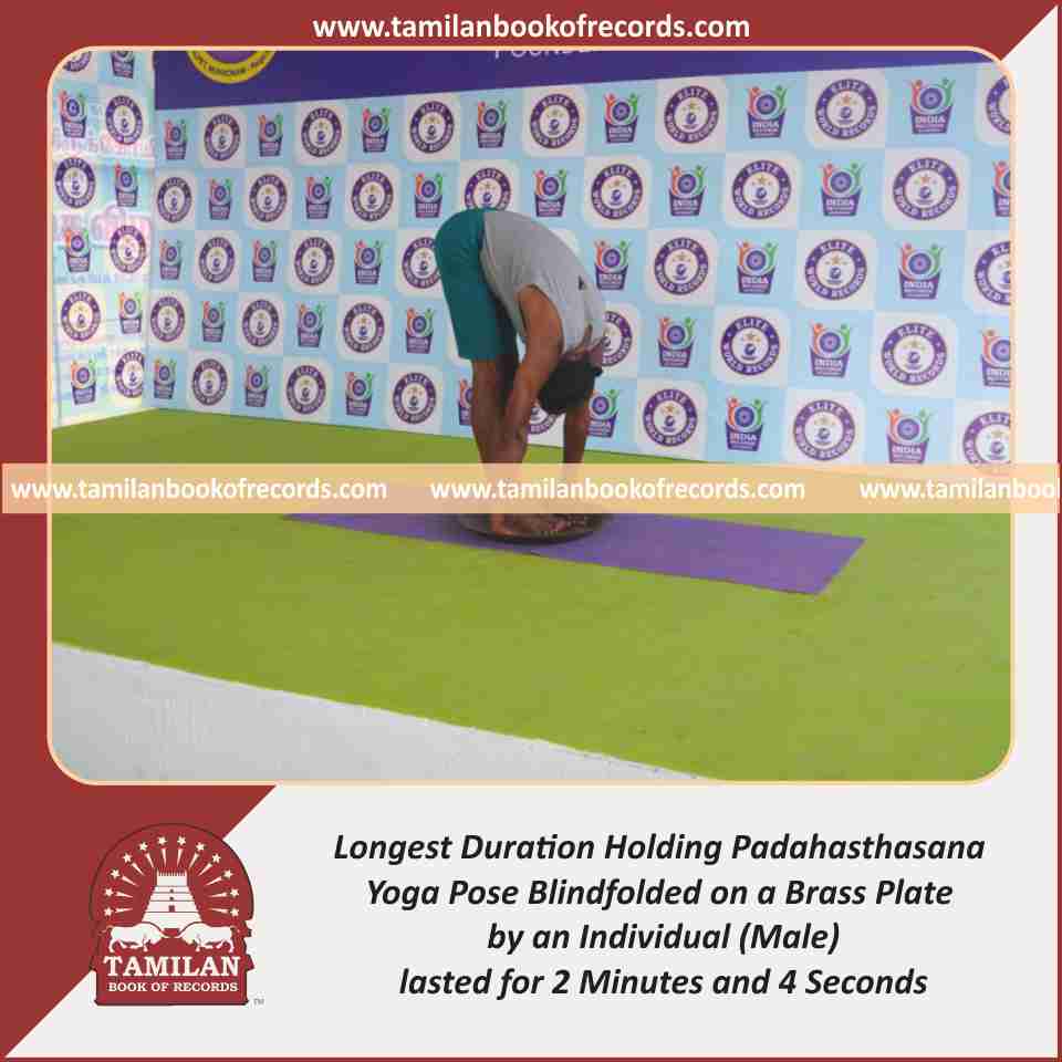 Longest Duration Holding Padahasthasana Yoga Pose Blindfolded on a Brass Plate by an Individual (Male)