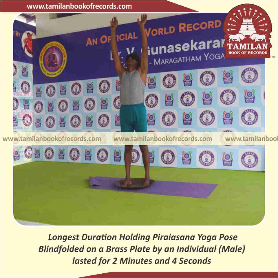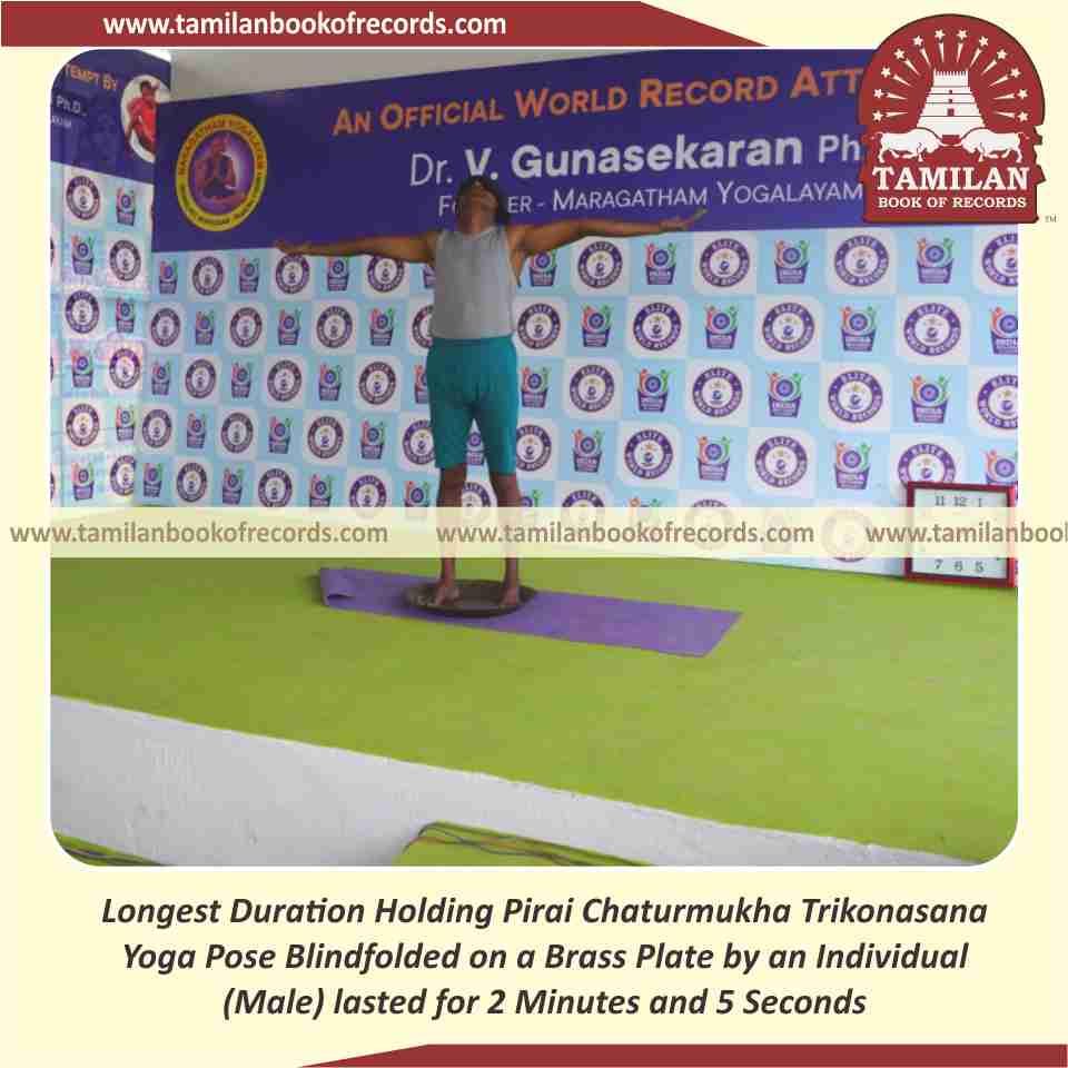 Longest Duration Holding Pirai Chaturmukha Trikonasana Yoga Pose Blindfolded on a Brass Plate by an Individual (Male)