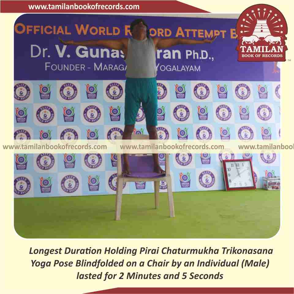 Longest Duration Holding Pirai Chaturmukha Trikonasana Yoga Pose Blindfolded on a Chair by an Individual (Male)
