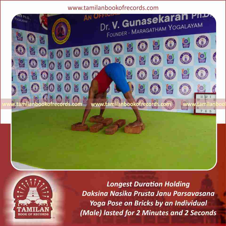 Longest Duration Holding Daksina Nasika Prusta Janu Parsavasana Yoga Pose on Bricks by an Individual (Male)