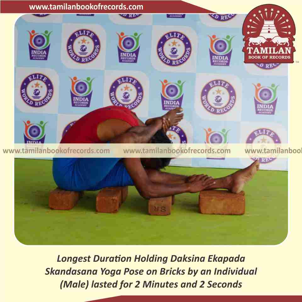 Longest Duration Holding Daksina Ekapada Skandasana Yoga Pose on Bricks by an Individual (Male)