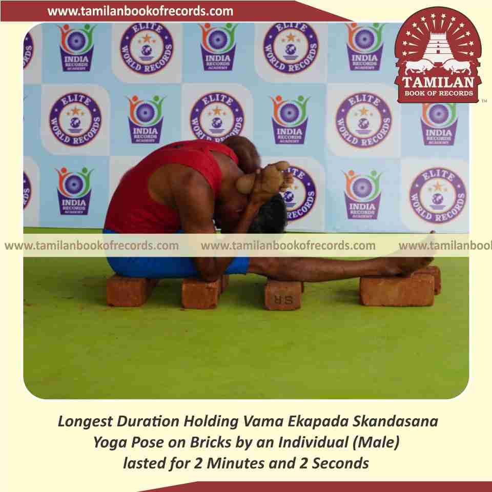 Longest Duration Holding Vama Ekapada Skandasana Yoga Pose on Bricks by an Individual (Male)