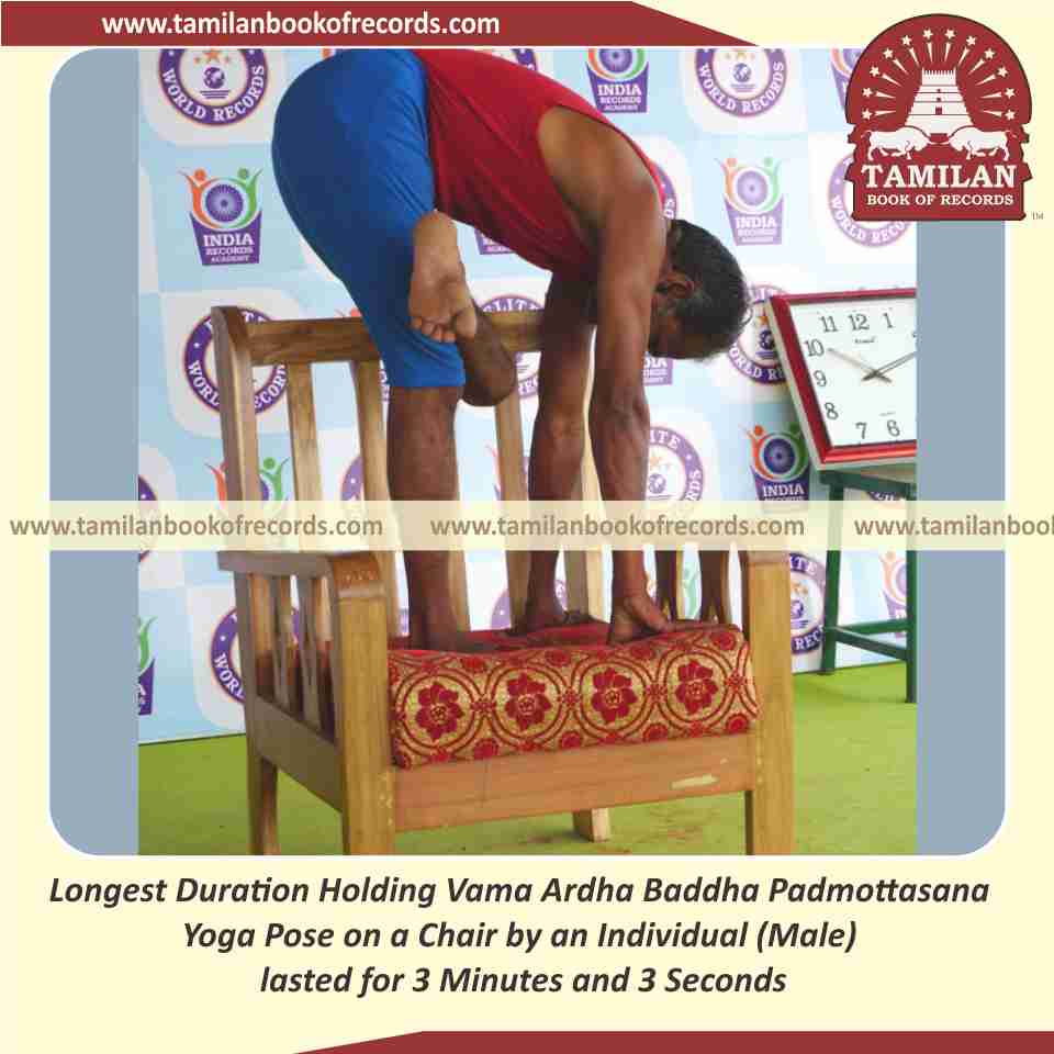 Longest Duration Holding Vama Ardha Baddha Padmottasana Yoga Pose on a Chair by an Individual (Male)