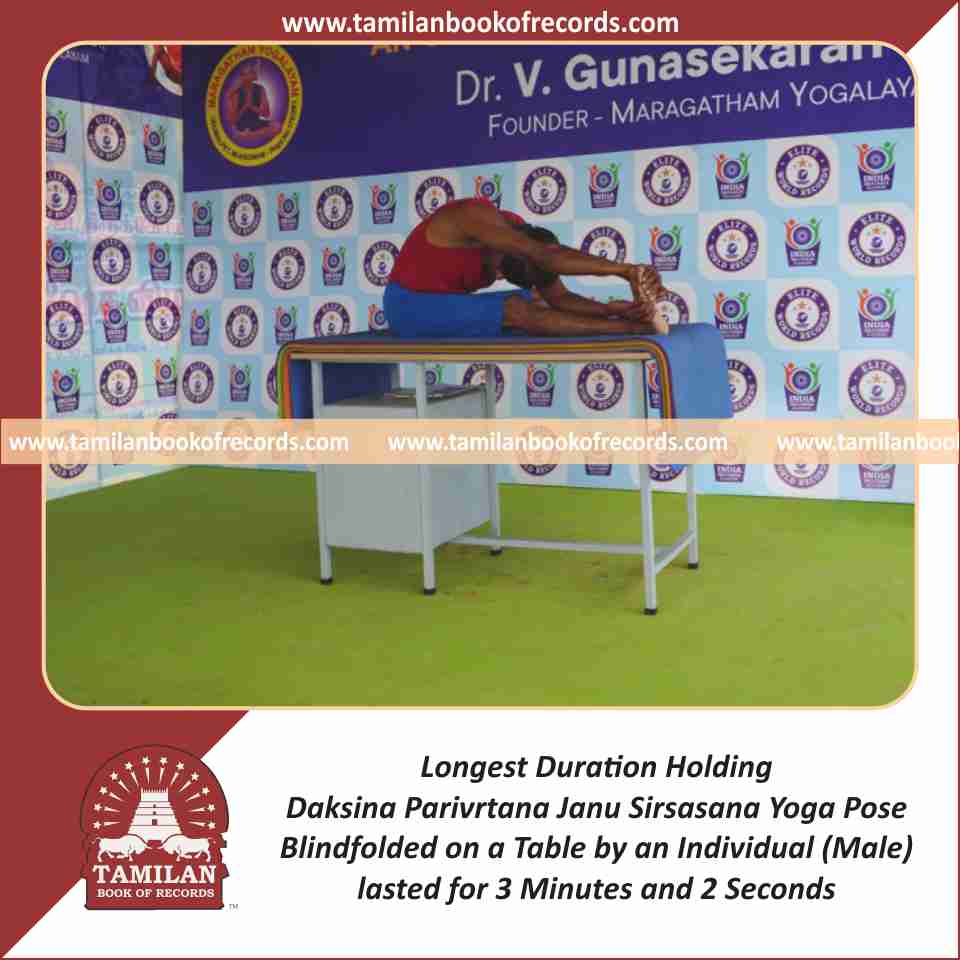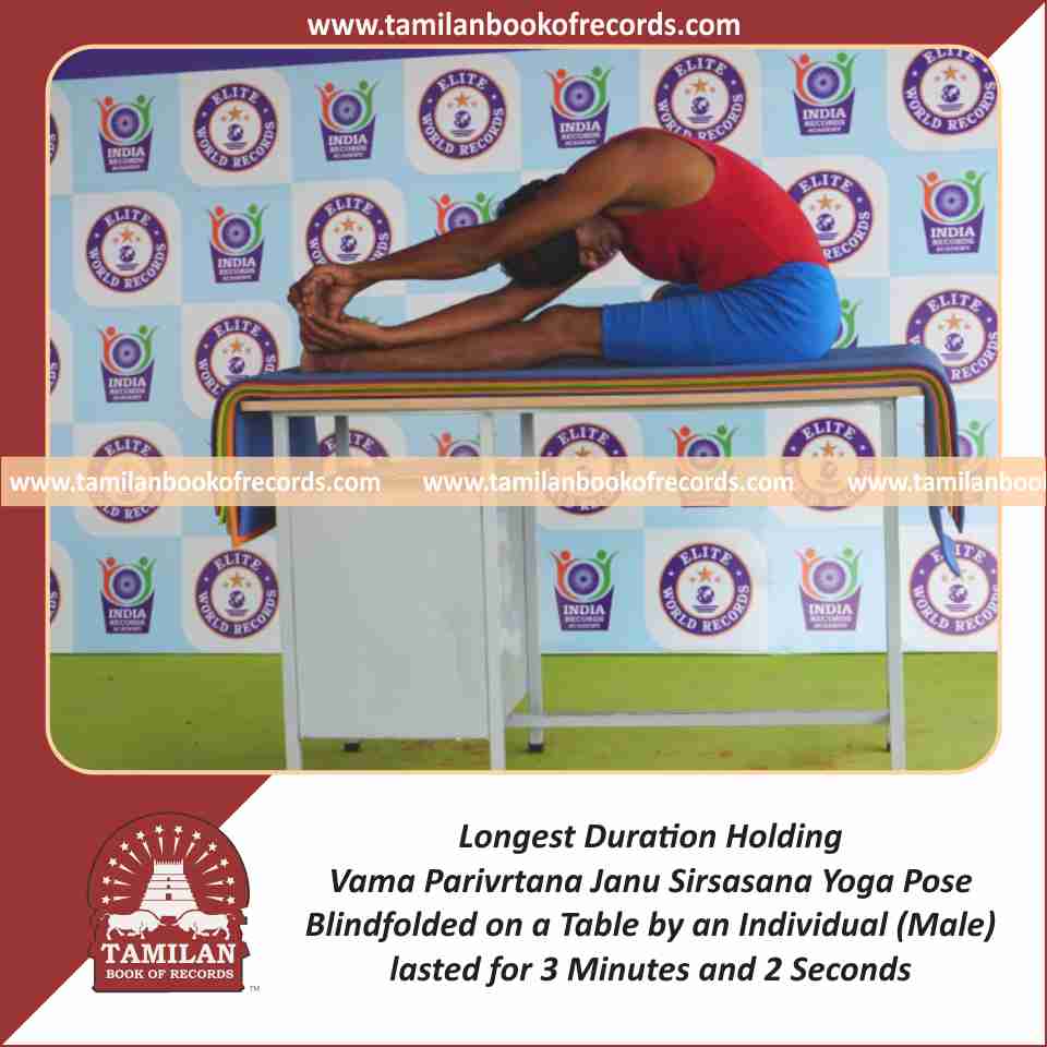 Longest Duration Holding Vama Parivrtana Janu Sirsasana Yoga Pose Blindfolded on a Table by an Individual (Male)