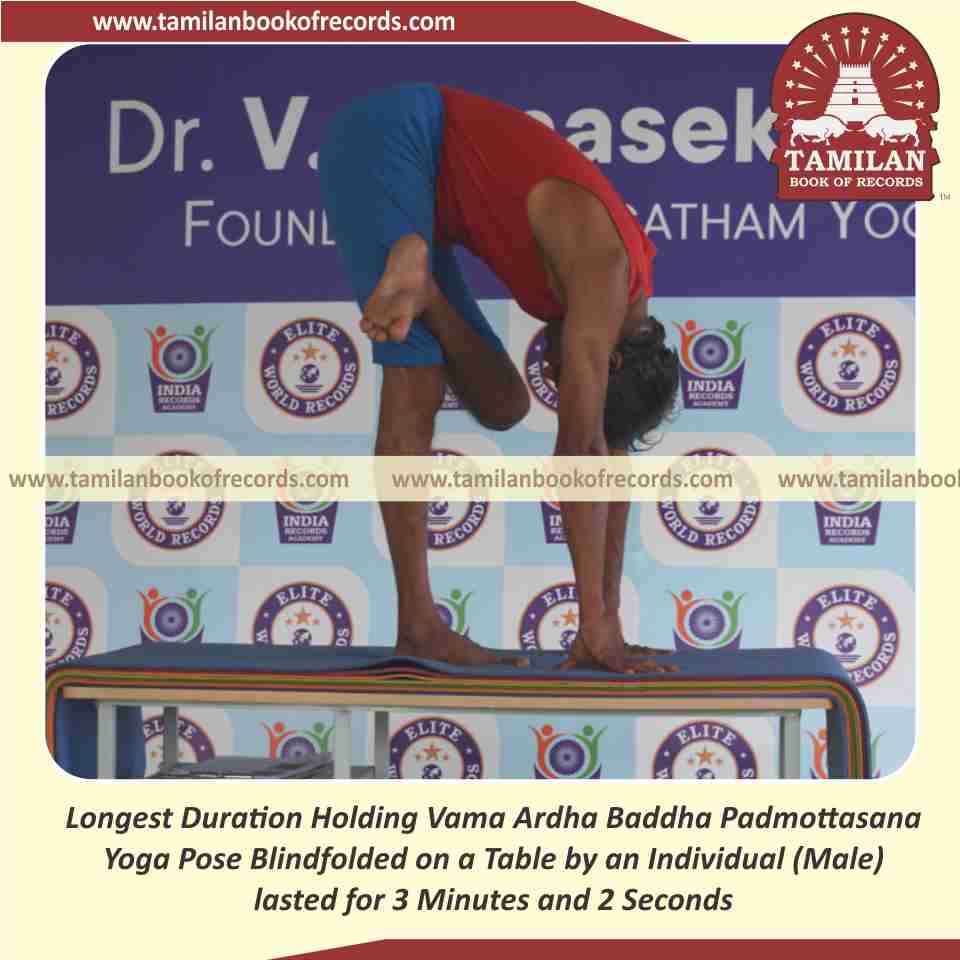 Longest Duration Holding Vama Ardha Baddha Padmottasana Yoga Pose Blindfolded on a Table by an Individual (Male)