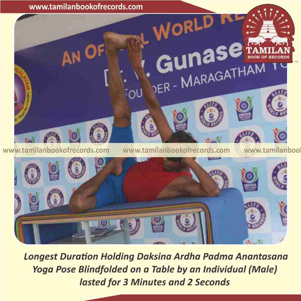 Longest Duration Holding Daksina Ardha Padma Anantasana Yoga Pose Blindfolded on a Table by an Individual (Male)