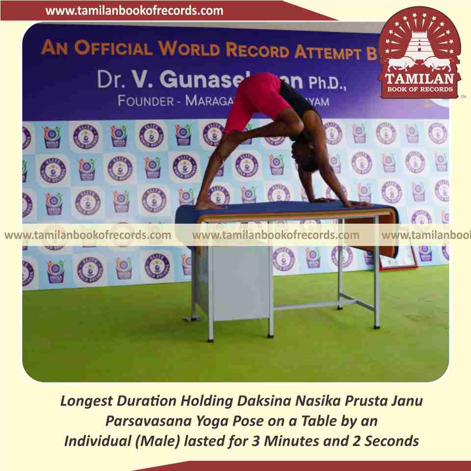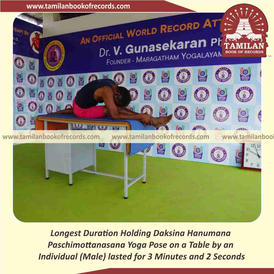 Longest Duration Holding Daksina Hanumana Paschimottanasana Yoga Pose on a Table by an Individual (Male)