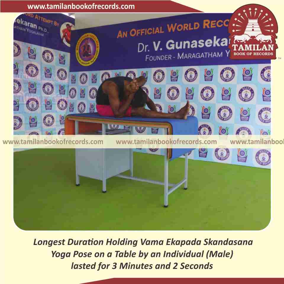 Longest Duration Holding Vama Ekapada Skandasana Yoga Pose on a Table by an Individual (Male)