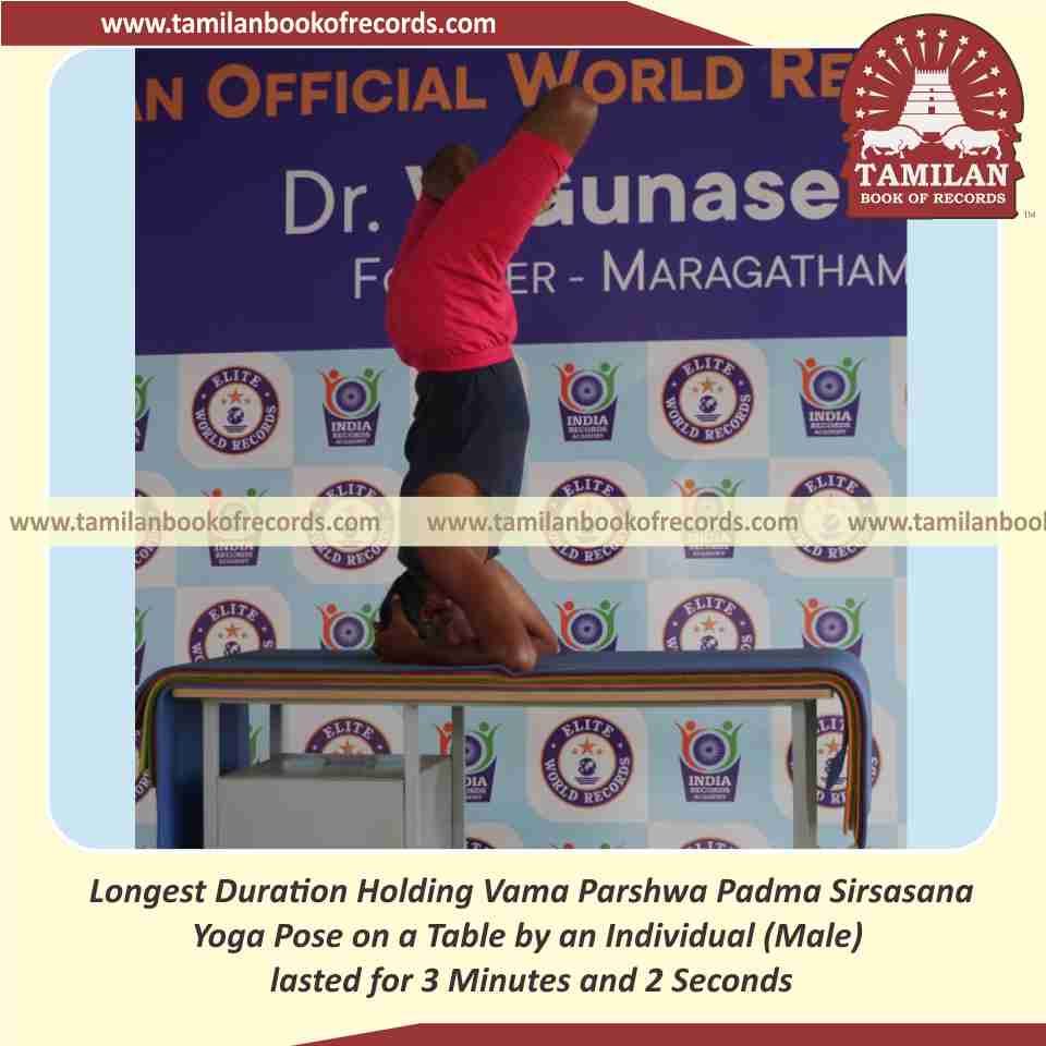 Longest Duration Holding Vama Parshwa Padma Sirsasana Yoga Pose on a Table by an Individual (Male)