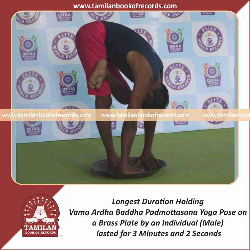 Longest Duration Holding Vama Ardha Baddha Padmottasana Yoga Pose on a Brass Plate by an Individual (Male)