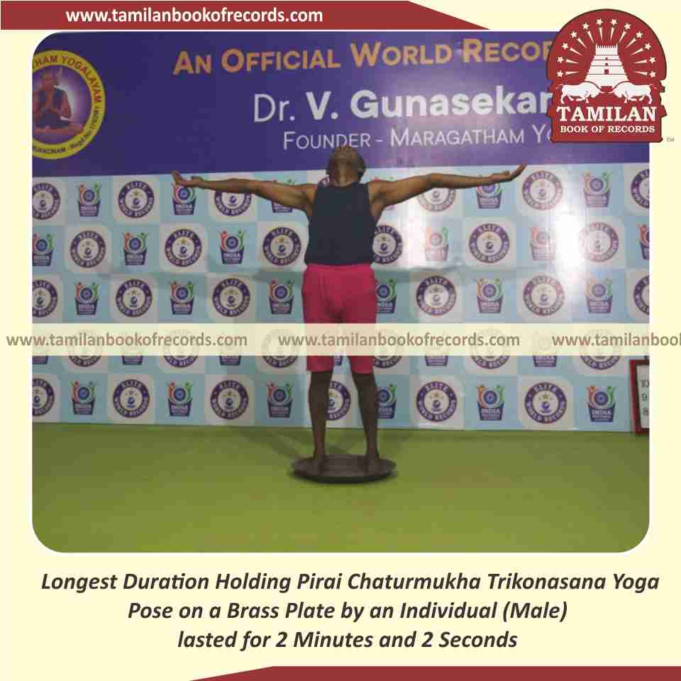 Longest Duration Holding Pirai Chaturmukha Trikonasana Yoga Pose on a Brass Plate by an Individual (Male)