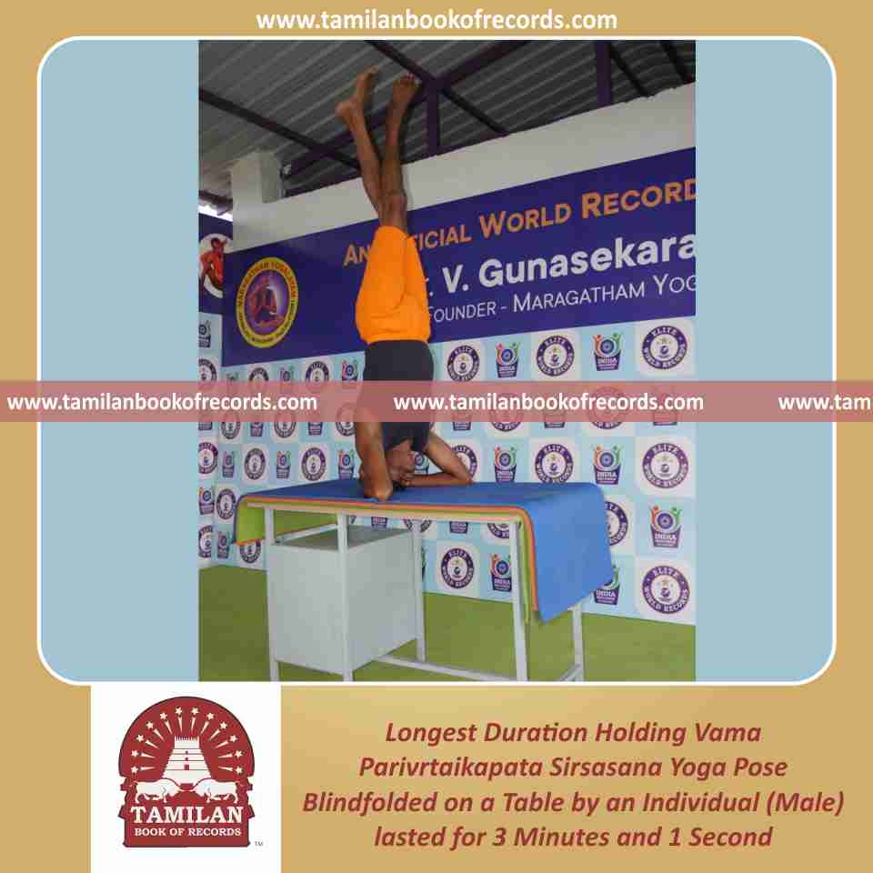 Longest Duration Holding Vama Parivrtaikapata Sirsasana Yoga Pose Blindfolded on a Table by an Individual (Male)