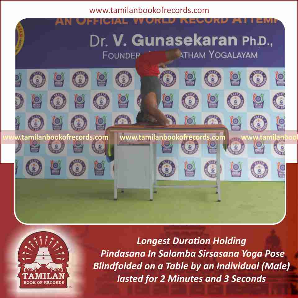 Longest Duration Holding Pindasana In Salamba Sirsasana Yoga Pose Blindfolded on a Table by an Individual (Male)