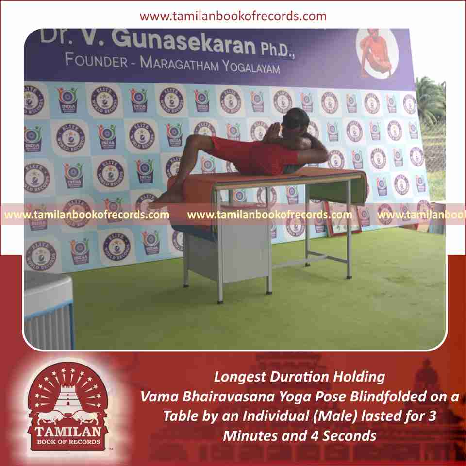 Longest Duration Holding Vama Bhairavasana Yoga Pose Blindfolded on a Table by an Individual (Male)