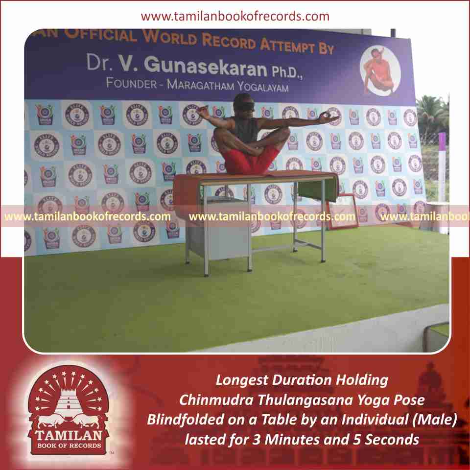 Longest Duration Holding Chinmudra Thulangasana Yoga Pose Blindfolded on a Table by an Individual (Male)