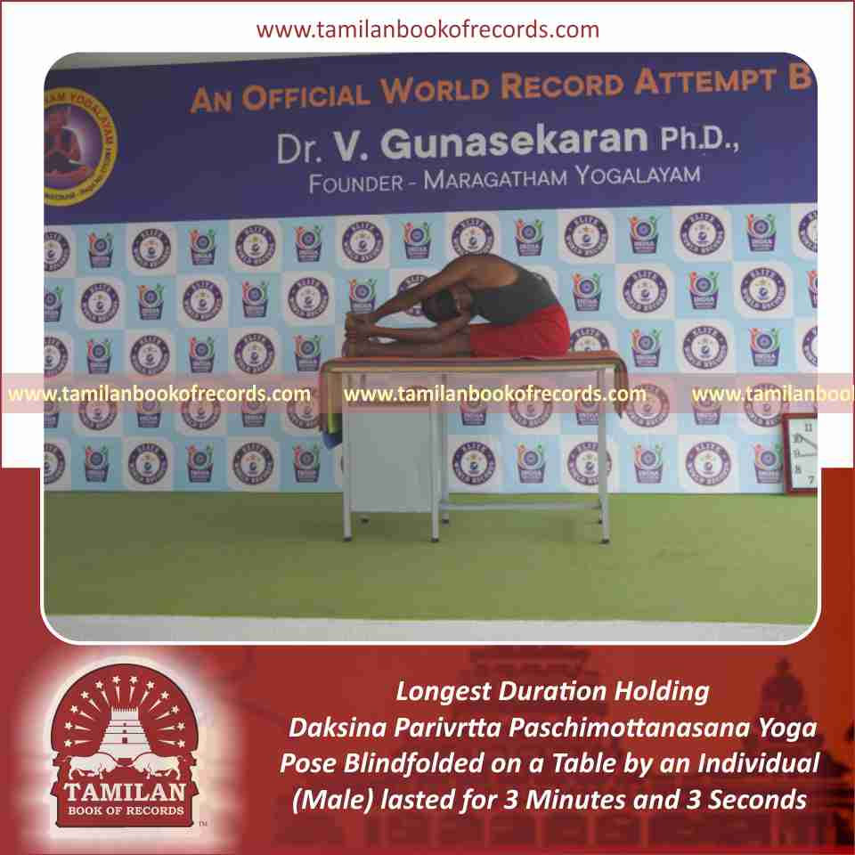 Longest Duration Holding Daksina Parivrtta Paschimottanasana Yoga Pose Blindfolded on a Table by an Individual (Male)