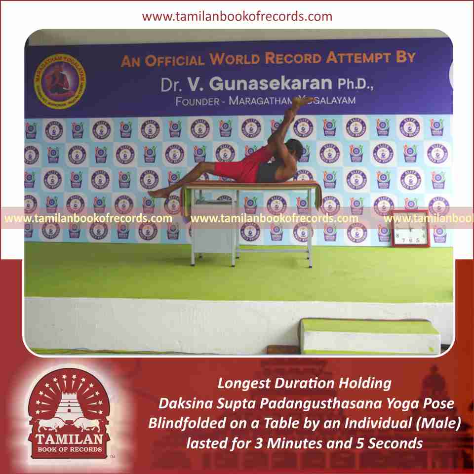 Longest Duration Holding Daksina Supta Padangusthasana Yoga Pose Blindfolded on a Table by an Individual (Male)