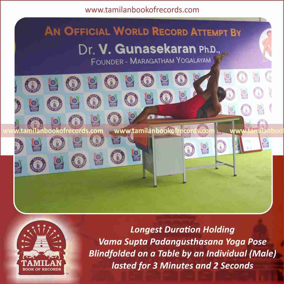 Longest Duration Holding Vama Nasika Purusta Janu Parsvasana Yoga Pose Blindfolded on a Table by an Individual (Male)
