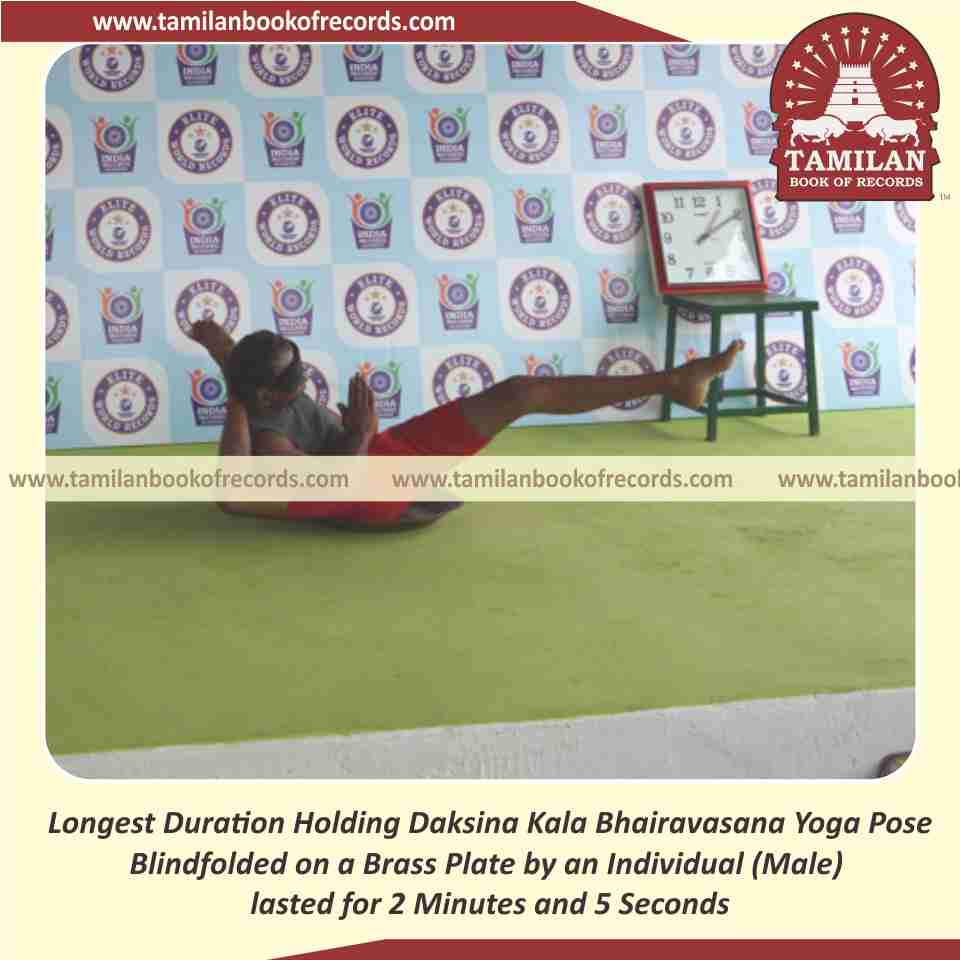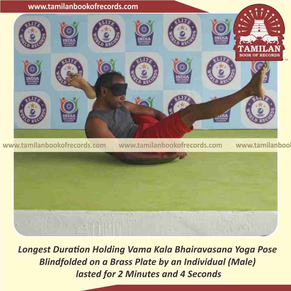 Longest Duration Holding Vama Kala Bhairavasana Yoga Pose Blindfolded on a Brass Plate by an Individual (Male)