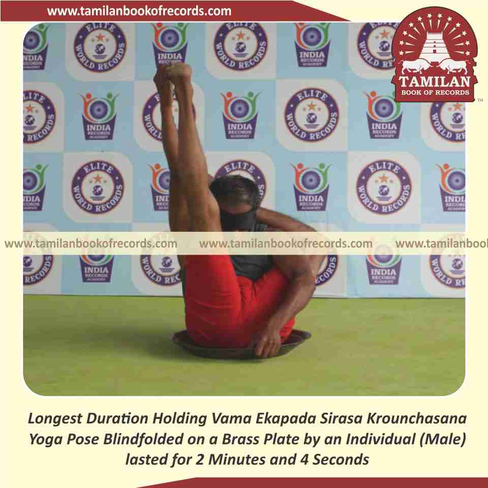 Longest Duration Holding Vama Ekapada Sirasa Krounchasana Yoga Pose Blindfolded on a Brass Plate by an Individual (Male)