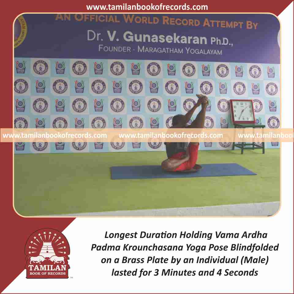 Longest Duration Holding Daksina Ardha Padma Krounchasana Yoga Pose Blindfolded on a Brass Plate by an Individual (Male)